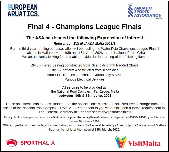 Malta shall be hosting the Final 4 of the European Aquatics Champions league, between the 10th and 13th June 2026 which event shall be organized by Aquatic Sports Association of Malta. For this event, the participation is of the Top 4 Male and Female Waterpolo teams in Europe.